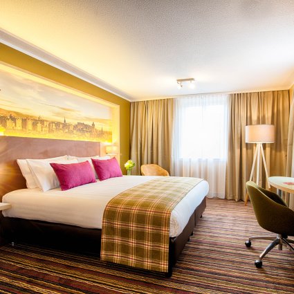Our preferred category GOLD hotel is the Leonardo Royal Hotel Edinburgh Haymarket, a 4-star hotel located just by the Haymarket station and a couple of minutes from Edinburgh castle. This city centre hotel has a perfect location for attractions, restaurants, shopping and nightlife. The hotel has 24-hour room service, a restaurant and bar as well as comfortable spacious guest rooms with all amenities expected in a 4-star hotel. Breakfast is included.