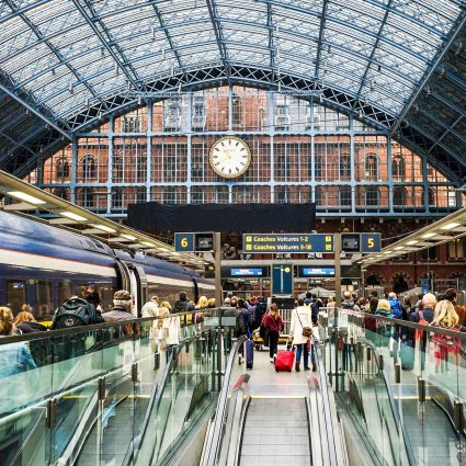 Travel in comfort on Eurostar from Paris Gare du Nord to London St. Pancras station.